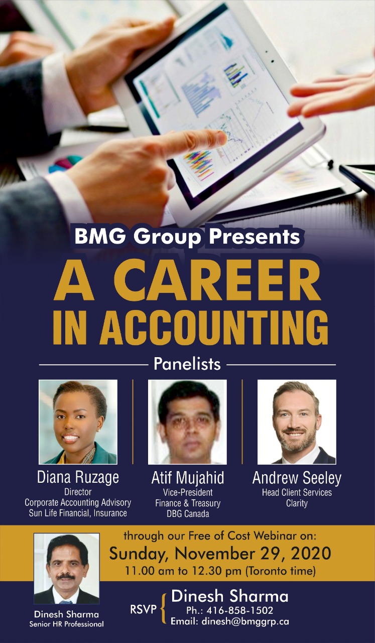 « All Events This event has passed. A Career in Accounting November 29, 2020 @ 11:00 am - 12:30 pm « How to Build a Career in Analytics BMG Group Virtual Holiday Party » Add to calendar Google Calendar iCalendar Outlook 365 Outlook Live Details Date: November 29, 2020 Time: 11:00 am - 12:30 pm Website: mailto:dinesh@bmggrp.ca Venue Webinar Organizer BMG Group View Organizer Website