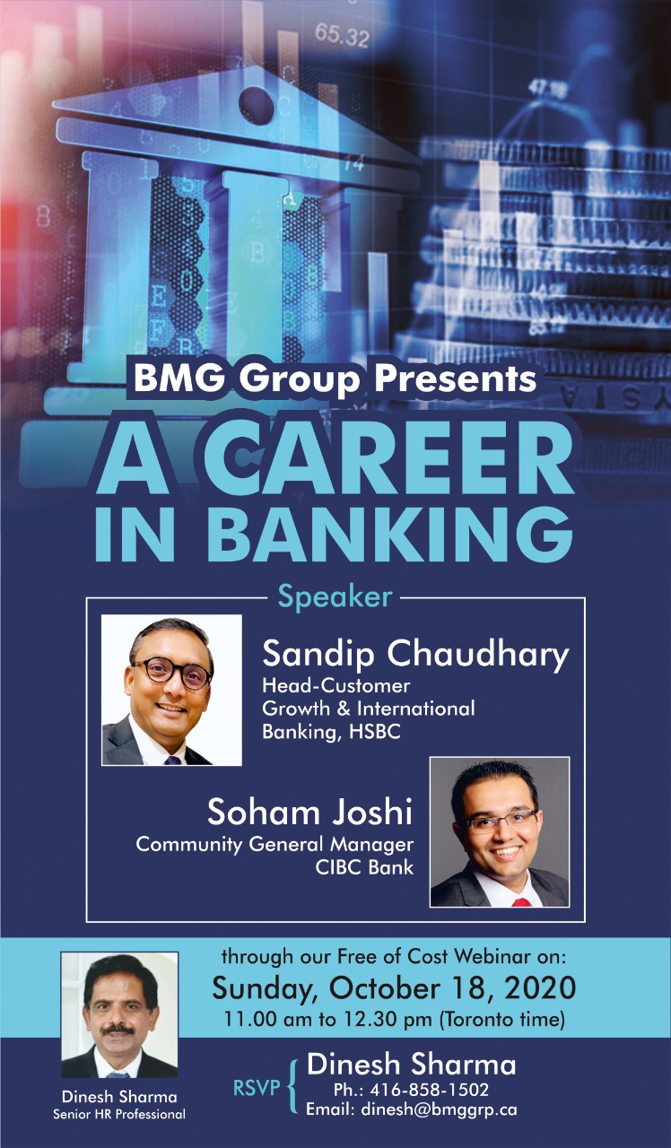 « All Events This event has passed. A Career In Banking October 18, 2020 @ 11:00 am - 12:30 pm « Recruitment Challenges 2020-2021 & How to Address them HOOPP Information Session with Recruitment Team – October 20, 2020 » Add to calendar Google Calendar iCalendar Outlook 365 Outlook Live Details Date: October 18, 2020 Time: 11:00 am - 12:30 pm Website: mailto:dinesh@bmggrp.ca Venue Webinar Organizer BMG Group View Organizer Website