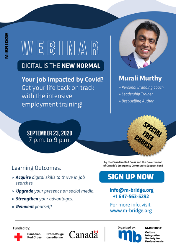 « All Events This event has passed. Digital is the New Normal September 23, 2020 @ 7:00 pm - 9:00 pm « Manufacturing in Ontario – The Road Ahead Importance of Small Talk in Canadian Business Culture » Add to calendar Google Calendar iCalendar Outlook 365 Outlook Live Details Date: September 23, 2020 Time: 7:00 pm - 9:00 pm Website: https://m-bridge.org Organizer M-Bridge Culture Integration Society for Professionals Email https://m-bridge.org Venue Webinar