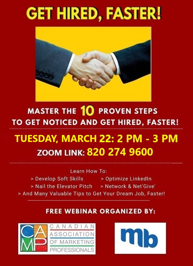 « All Events This event has passed. Get Hired Faster – Webinar Tuesday, March 22, 2-3 pm March 22, 2022 @ 2:00 pm - 3:00 pm « Get Hired Faster – Webinar Wednesday December 15, 2-3 pm Get Hired Faster! A Joint Webinar from CAMP Networking & M-Bridge » Add to calendar Google Calendar iCalendar Outlook 365 Outlook Live Details Date: March 22, 2022 Time: 2:00 pm - 3:00 pm Website: https://us02web.zoom.us/j/8202749600 Organizers CAMP Networking M-Bridge Culture Integration Society for Professionals Venue Webinar