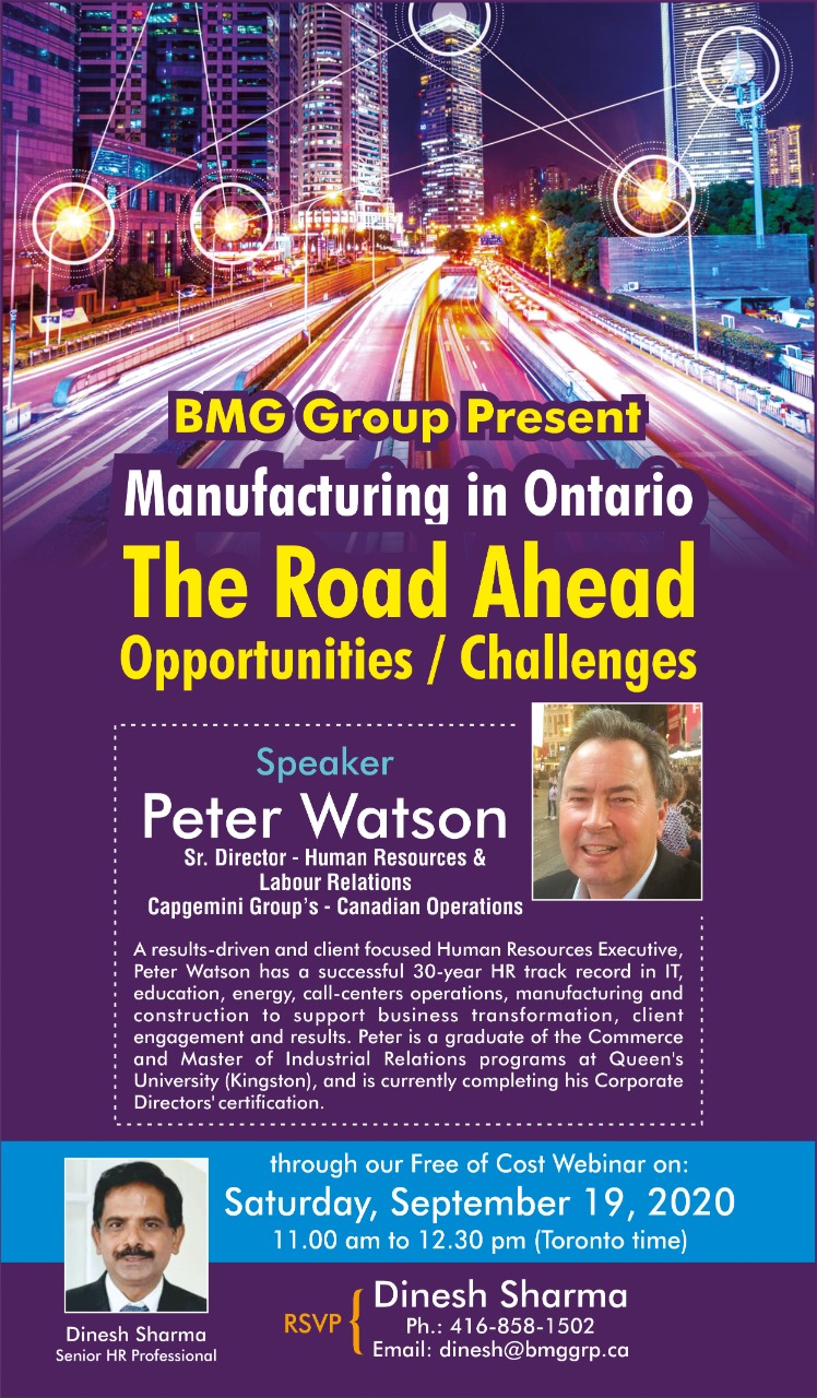 « All Events This event has passed. Manufacturing in Ontario – The Road Ahead September 19, 2020 @ 11:00 am - 12:30 pm « PINs Webinar – Salary Negotiation Tactics for Women Digital is the New Normal » Add to calendar Google Calendar iCalendar Outlook 365 Outlook Live Details Date: September 19, 2020 Time: 11:00 am - 12:30 pm Website: https://www.eventbrite.ca/e/manufacturing-in-Ontario-the-road-ahead-opportunities-challenges-tickets-119969198101 Venue Webinar Organizer BMG Group View Organizer Website