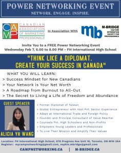« All Events This event has passed. Power Networking Workshop: THINK LIKE A DIPLOMAT, CREATE YOUR SUCCESS IN CANADA February 7, 2024 @ 6:00 pm - 8:00 pm « TRIEC-Manulife Financial Literacy Session TRIEC PINs Sector-Specific Event: Understanding Hiring Practices in the Accounting and Finance Sector in Canada » Add to calendar Google Calendar iCalendar Outlook 365 Outlook Live Details Date: February 7, 2024 Time: 6:00 pm - 8:00 pm Organizer CAMP Networking Canada and M-Bridge Venue FH International High School 670, Progress Ave, Unit 16 Scarborough, ON M1H 3A4 + Google Map