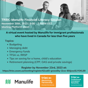 « All Events This event has passed. TRIEC-Manulife Financial Literacy Session November 30, 2023 @ 6:00 pm - 7:30 pm Free « Power Networking Event: Network, Engage, Inspire Power Networking Workshop: THINK LIKE A DIPLOMAT, CREATE YOUR SUCCESS IN CANADA » Add to calendar Google Calendar iCalendar Outlook 365 Outlook Live Details Date: November 30, 2023 Time: 6:00 pm - 7:30 pm Cost: Free Website: https://triec.zoom.us/meeting/register/tZcsdO-grzooEty-i2cw-8StjcezSLYOKL89#/registration Organizer Manulife Venue Zoom Meeting