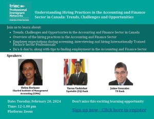 « All Events This event has passed. TRIEC PINs Sector-Specific Event: Understanding Hiring Practices in the Accounting and Finance Sector in Canada February 20, 2024 @ 12:00 pm - 1:00 pm Free « Power Networking Workshop: THINK LIKE A DIPLOMAT, CREATE YOUR SUCCESS IN CANADA TRIEC PINS TALENT XCHANGE 2024 Underemployment: Impact on Immigrants and the Economy » Add to calendar Google Calendar iCalendar Outlook 365 Outlook Live Details Date: February 20, 2024 Time: 12:00 pm - 1:00 pm Cost: Free Website: https://triec.zoom.us/meeting/register/tZwudO2vqTojGdLLwQDOpPQjlpVjYL6GKnQO#/registration Organizer TRIEC Venue Zoom Meeting